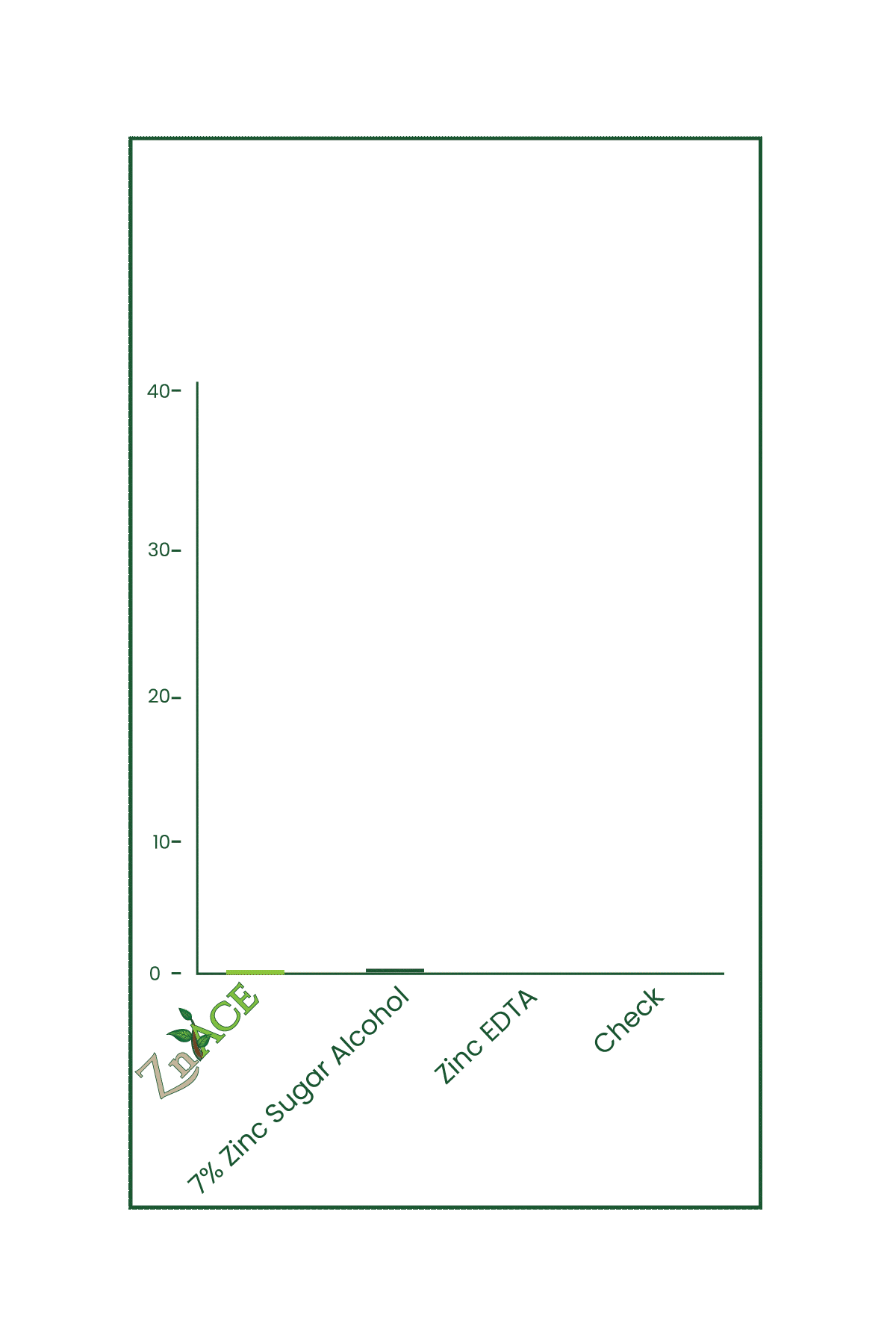 We had our suspicions, but we've recently confirmed them. We contracted an independent third-party research organization to test the validity of our zinc acetate compared to other leading zinc products. In this trial, CultivAce ZnAce, our 8% zinc acetate, was applied through the drip at a rate of 2 quarts per acre. Zinc EDTA and Zinc Sugar alcohol were applied at equal concentrations. Tissue samples to show concentrations were taken 6 days after application and compared to the untreated check. The results were phenomenal! Cultivace ZnAce, outperformed the zinc sugar alcohol by 22% while matching performance with the Zinc EDTA, increasing zinc tissue concentration by 100% over the check.