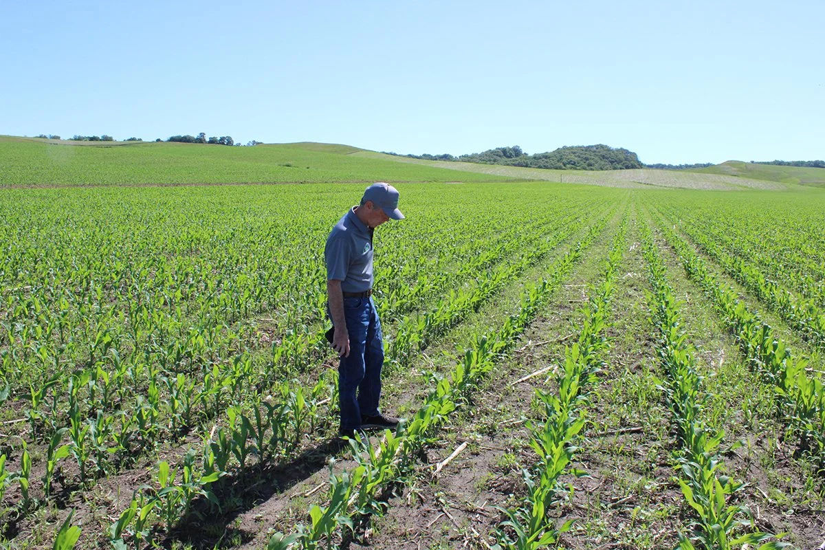 It was immediately apparent that this grower's no-till practices were helping keep moisture in the field, and the crop was visually benefiting, displaying a prime example of the benefits of no-till corn in Wisconsin. Chuck inspected the field and then went into the standard practice pass. His shovel struck rich dark dirt and unearthed a corn plant. Earthworms squirmed throughout the upturned dirt.