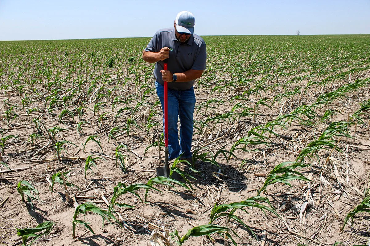 After a look at the field map, Chad went to work digging out a plant from each practice. Even though the heat was baking the ground (the week we were visiting recorded multiple mid-90s days), it soon became apparent that this field was a perfect example of Kansas no-till farming. His shovel pierced a dry layer of crust, but before long, it reached damp earth. The previous year's corn stubble did a fantastic job keeping moisture around the root zone. After gathering plants from each practice, Free Phos 24 liquid phosphate fertilizer proved triumphant.